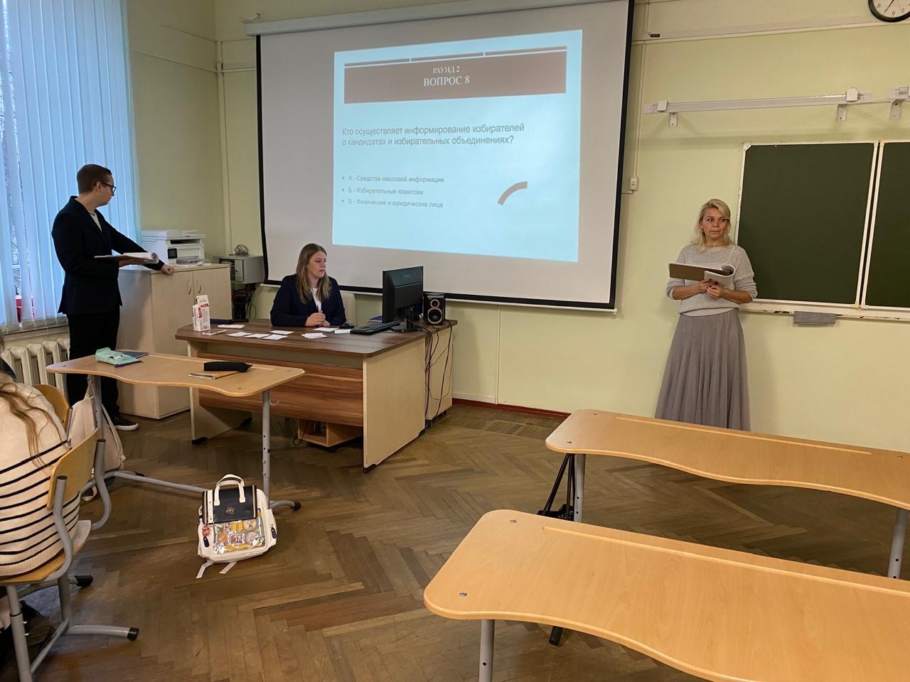 Обучающие мероприятия прошли для учащихся 10х и 11-х классов: ГБОУ СОШ №412, гимназии № 426 имени Героя Советского Союза Г.Д. Костылева и школы № 429 им. Героя РФ М.Ю. Малофеева председатели и сотрудники Территориальных избирательных комиссий подготовили и провели интеллектуальную игру-Квиз: «История выборов и избирательное право». Ребята отвечали на вопросы, работали в командах и вместе искали правильные решения. Квиз был посвящен базовым понятиям выборов и правам граждан, где участники, работая в командах, отвечали на вопросы и вместе находили правильные решения. Мероприятие носило образовательный и интерактивный характер, способствуя совместному изучению избирательного права и гражданских прав.