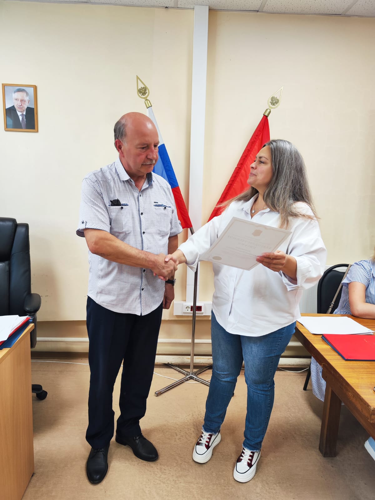 На заседании, в торжественной обстановке, председатель ТИК №8 Ершова Ирина вручила членам комиссии грамоты и благодарности Санкт-Петербургской избирательной комиссии за эффективную работу в период проведения избирательных кампаний в 2024 году. Уважаемые коллеги, хотим сказать слова благодарности за ваш вклад в избирательную систему района, города, страны - это пример преданности, ответственности и любви к своему делу. |